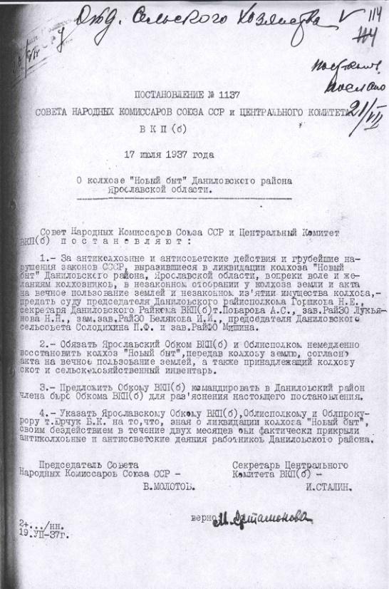 Постановление № 1137 СНК СССР и ЦК ВКП(б). О колхозе "Новый быт" Даниловского района Ярославской области. 17 июля 1937 г.