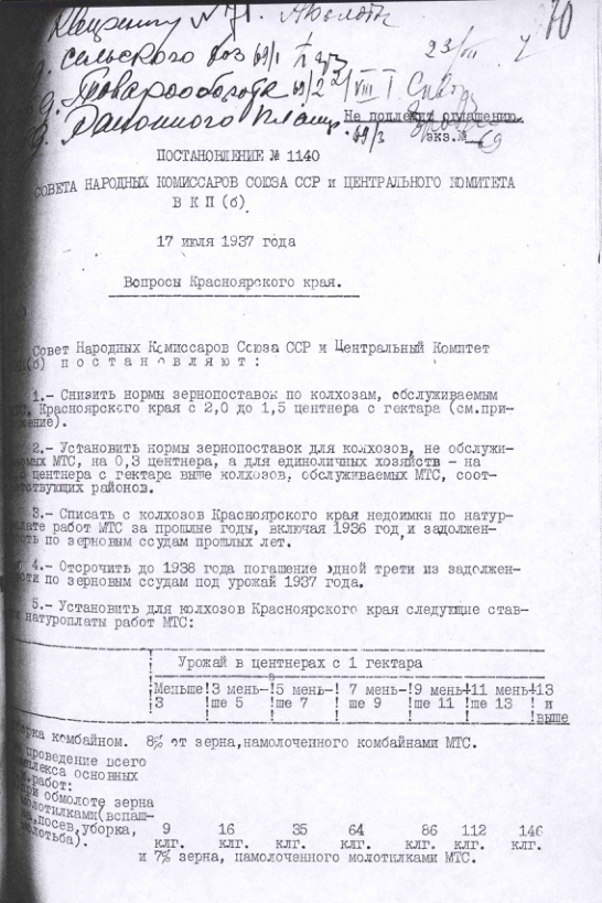 Постановление № 1140 СНК СССР и ЦК ВКП(б). Вопросы Красноярского края. 17 июля 1937 г.
