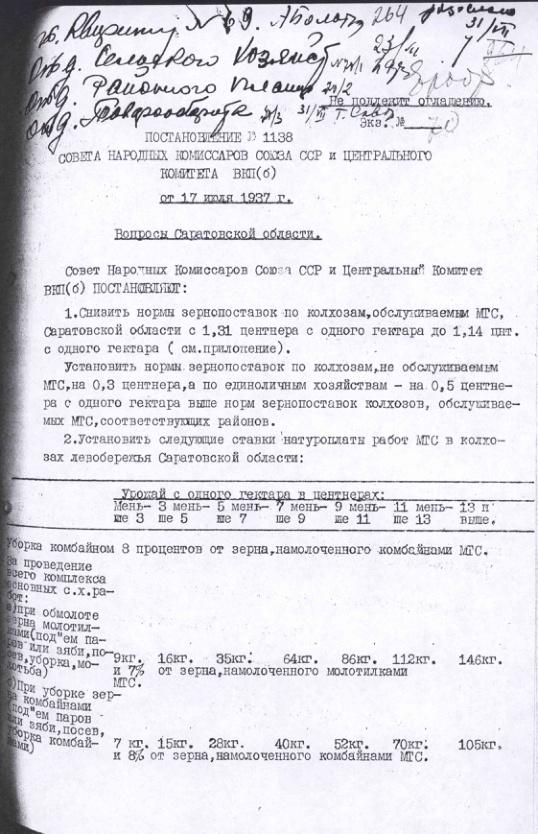 Постановление № 1138 СНК СССР и ЦК ВКП(б). Вопросы Саратовской области. 17 июля 1937 г.
