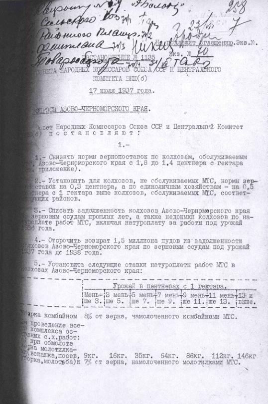Постановление № 1135 СНК СССР и ЦК ВКП(б). Вопросы Азово-Черноморского края. 17 июля 1937 г.