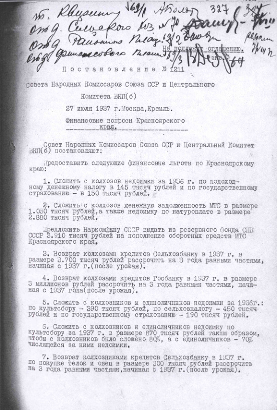 Постановление № 1211 СНК СССР и ЦК ВКП(б). Финансовые вопросы Красноярского края. 27 июля 1937 г.