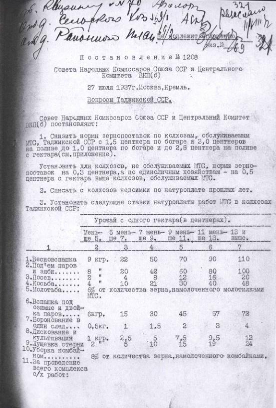 Постановление № 1208 СНК СССР и ЦК ВКП(б). Вопросы Таджикской ССР. 27 июля 1937 г.