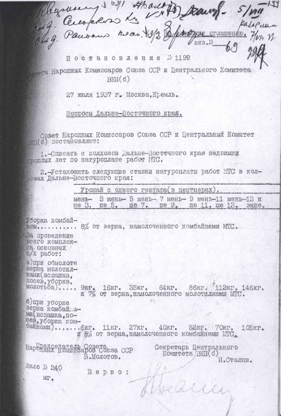 Постановление № 1199 СНК СССР и ЦК ВКП(б). Вопросы Дальне-Восточного края. 27 июля 1937 г.