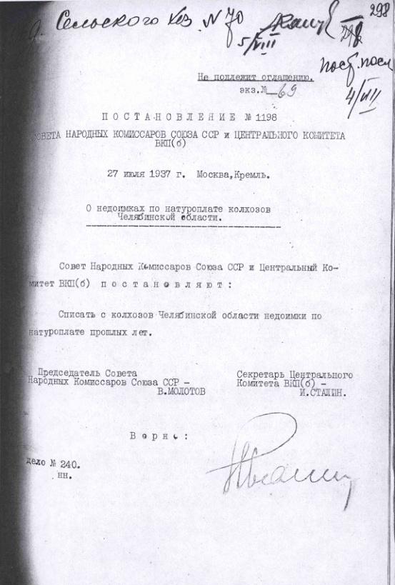 Постановление № 1198 СНК СССР и ЦК ВКП(б). О недоимках по натуроплате колхозов Челябинской области. 27 июля 1937 г.