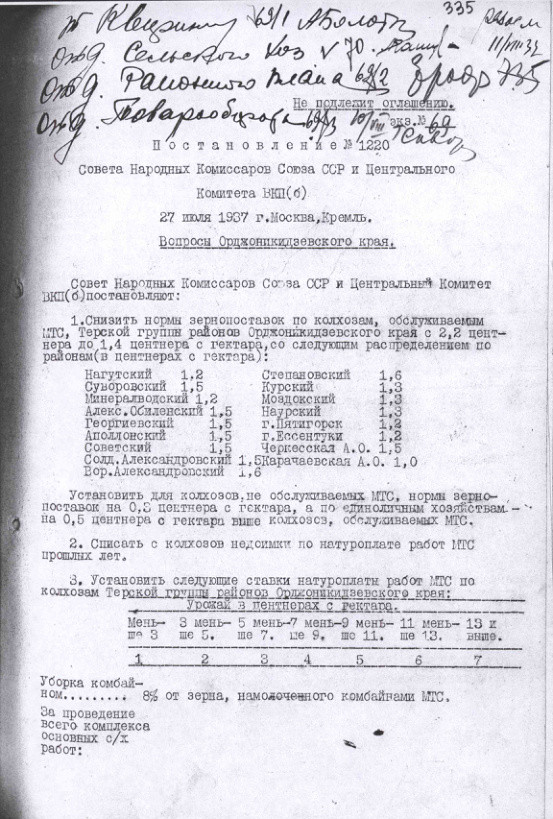 Постановление № 1220 СНК СССР и ЦК ВКП(б). Вопросы Орджоникидзевского края. 27 июля 1937 г.