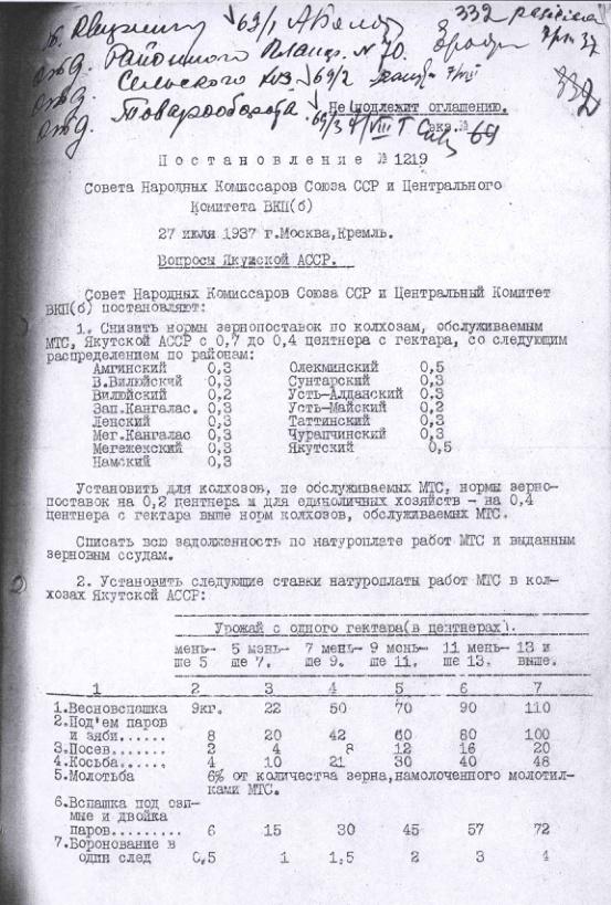 Постановление № 1219 СНК СССР и ЦК ВКП(б). Вопросы Якутской АССР. 27 июля 1937 г.