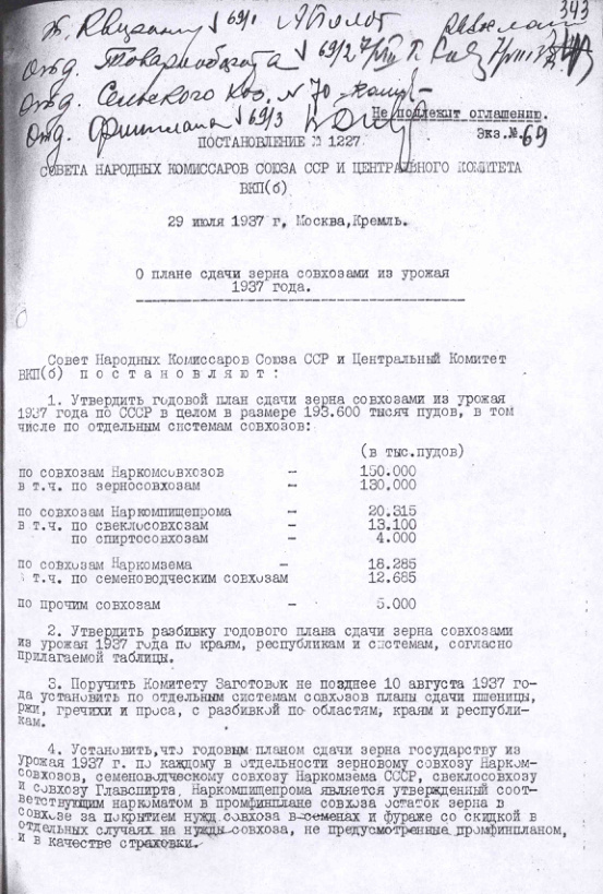 Постановление № 1227 СНК СССР и ЦК ВКП(б). О плане сдачи зерна совхозами из урожая 1937 года. 29 июля 1937 г.