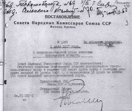 Постановление № 1035 СНК СССР. О продовольственной ссуде Колхозам Воронежской области. 2 июля 1937 г.