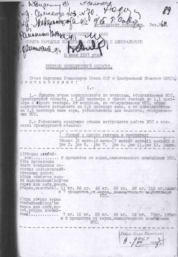 Постановление № 1066 СНК СССР и ЦК ВКП(б). Вопросы Оренбургской области. 5 июля 1937 г.