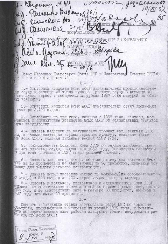 Постановление № 1065 СНК СССР и ЦК ВКП(б). Вопросы Коми АССР. 5 июля 1937 г.