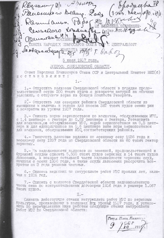 Постановление № 1063 СНК СССР и ЦК ВКП(б). Вопросы Свердловской области. 5 июля 1937 г.