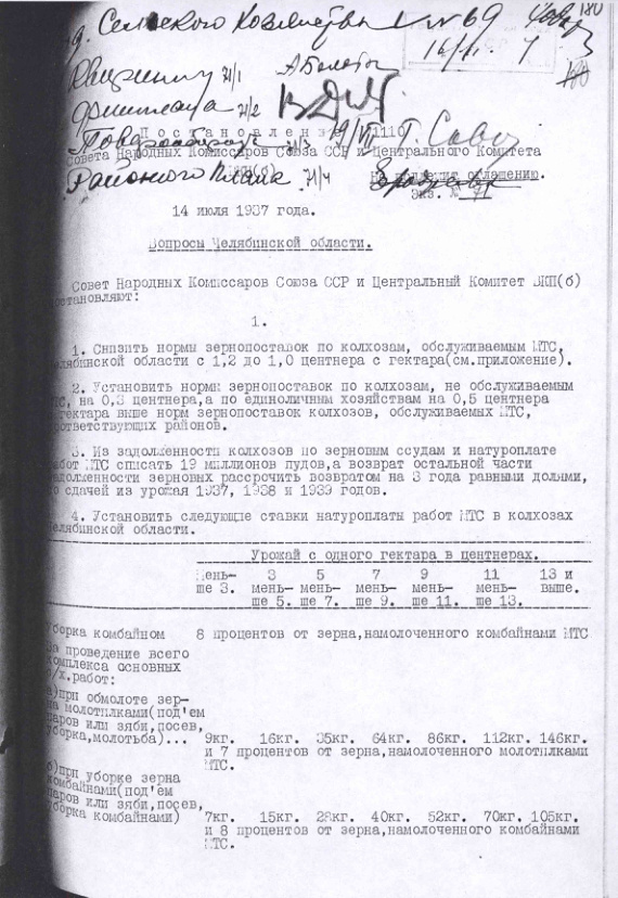 Постановление № 1110 СНК СССР и ЦК ВКП(б). Вопросы Челябинской области. 14 июля 1937 г.