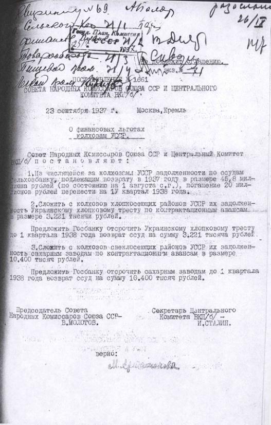Постановление № 1661 СНК СССР и ЦК ВКП(б). О финансовых льготах колхозам УССР. 23 сентября 1937 г.