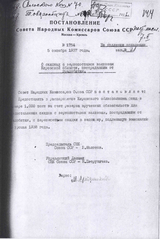 Постановление № 1754 СНК СССР. О скидках с зернопоставок колхозам Кировской области, пострадавшим от градобития. 5 октября 1937 г.