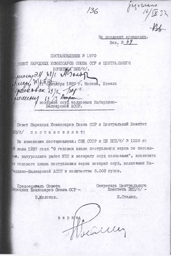 Постановление № 1570 СНК СССР и ЦК ВКП(б). О возврате ссуд колхозами Кабардино-Балкарской АССР. 11 сентября 1937 г.