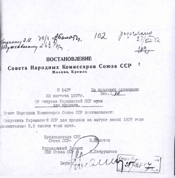 Постановление № 1437 СНК СССР. Об отпуске Украинской ССР муки для продажи. 23 августа 1937 г.