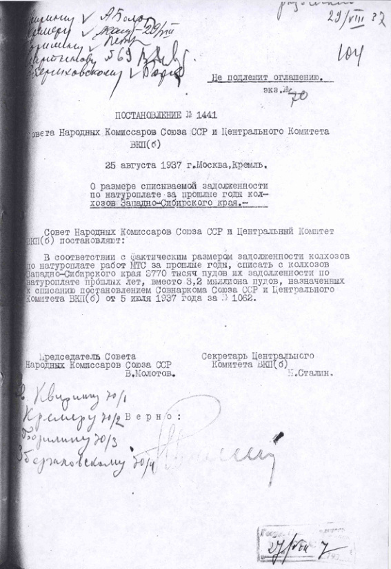 Постановление № 1441 СНК СССР и ЦК ВКП(б). О размере списываемой задолженности по натуроплате за прошлые годы колхозов Западно-Сибирского края. 25 августа 1937 г.