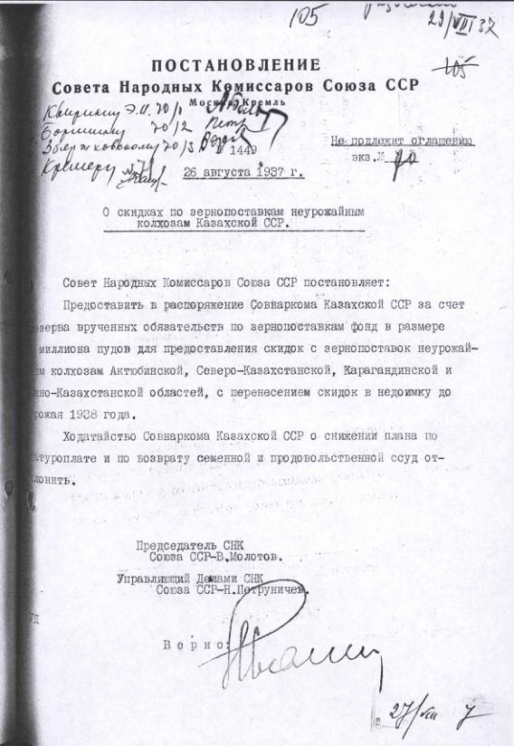 Постановление № 1449 СНК СССР. О скидках по зернопоставкам неурожайным колхозам Казахской ССР. 26 августа 1937 г.