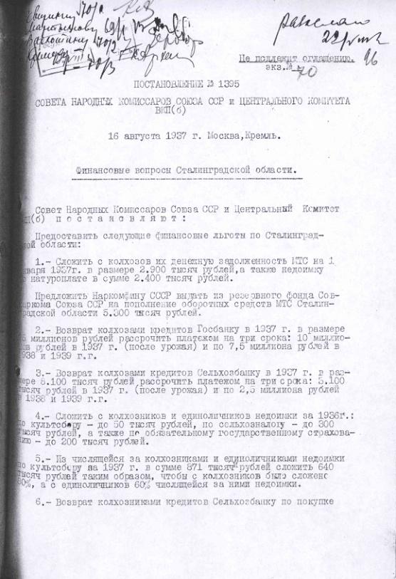 Постановление № 1395 СНК СССР и ЦК ВКП(б). Финансовые вопросы Сталинградской области. 16 августа 1937 г.