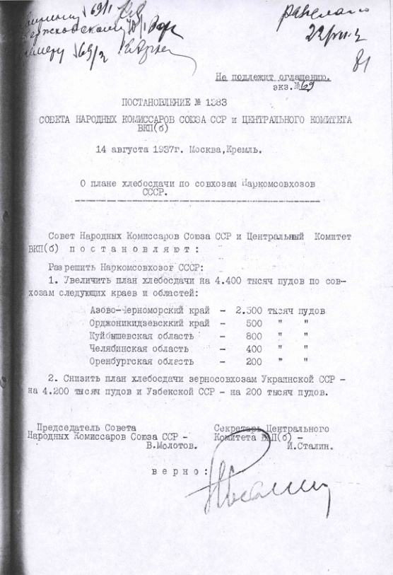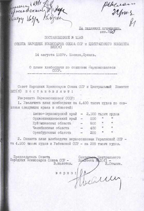 Постановление № 1383 СНК СССР и ЦК ВКП(б). О плане хлебосдачи по совхозам Наркомсовхозов СССР. 14 августа 1937 г.