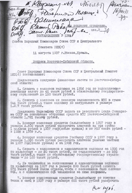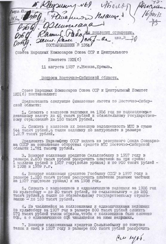 Постановление № 1354 СНК СССР и ЦК ВКП(б). Вопросы Восточно-Сибирской области. 11 августа 1937 г.
