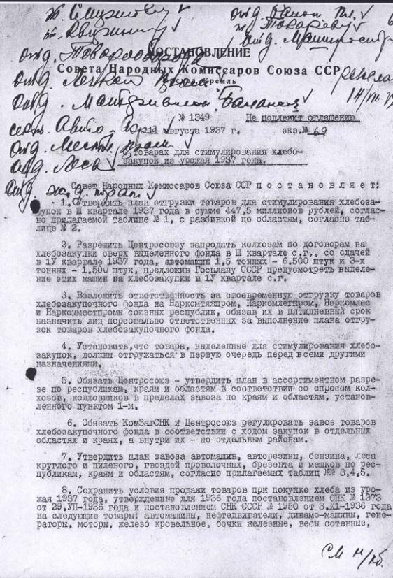 Постановление № 1349 СНК СССР. О товарах для стимулирования хлебо-закупок из урожая 1937 года. 11 августа 1937 г.