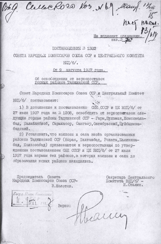 Постановление № 1332 СНК СССР И ЦК ВКП(б). Об освобождении от зернопоставок горных районов Таджикской ССР. 9 августа 1937 г.