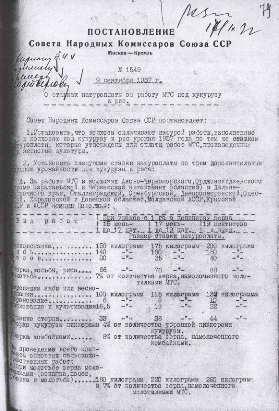 Постановление № 1549 СНК СССР. О ставках натуроплаты за работу МТС под кукурузу и рис. 9 сентября 1937 г.