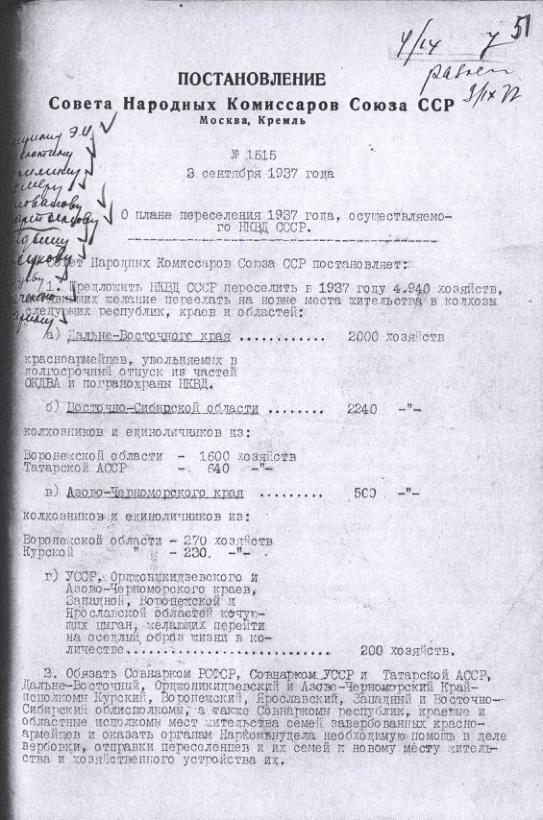 Постановление № 1515 СНК СССР. О плане переселения осуществляемого НКВД СССР. 3 сентября 1937 г.