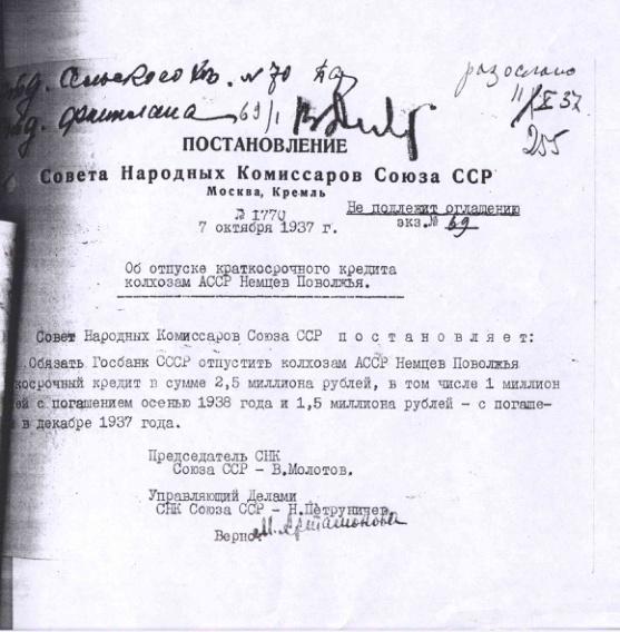 Постановление № 1770 СНК СССР. Об отпуске краткосрочного кредита колхозам АССР Немцев Поволжья. 7 октября 1937 г.