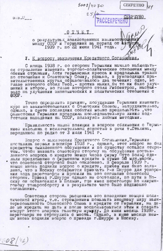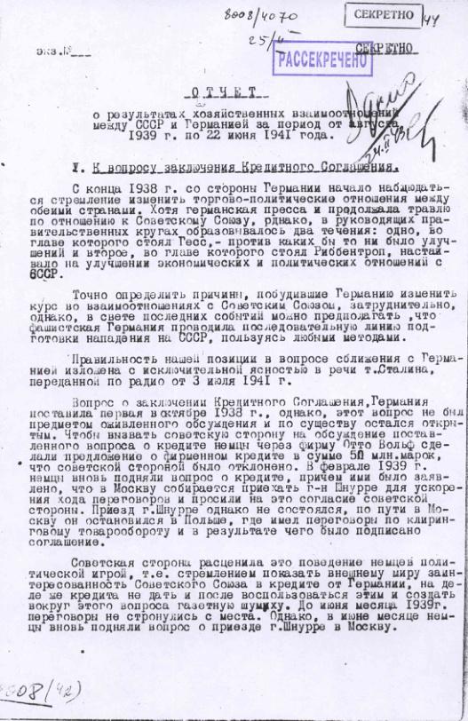 Отчет о результатах хозяйственных взаимоотношений между СССР и Германией с августа 1939 г. по 22 июня 1941 года.