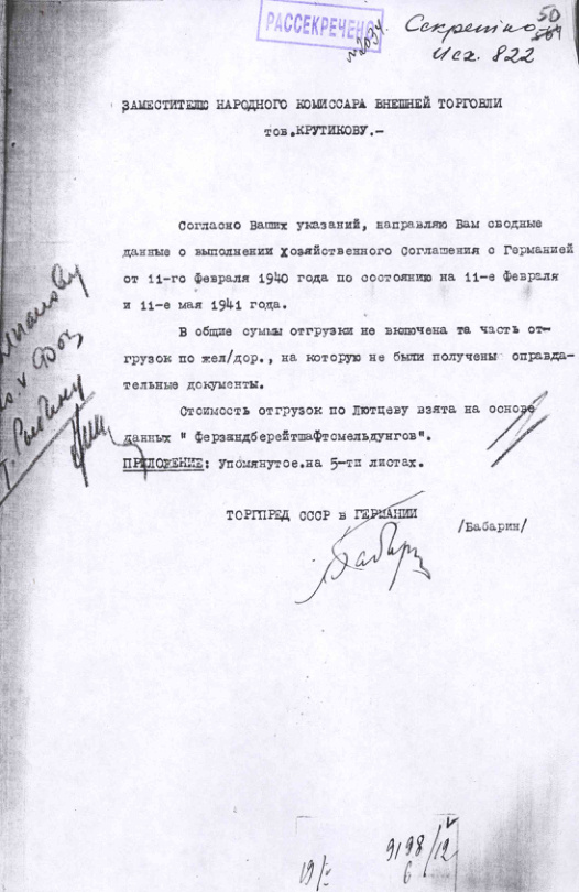 - Сводные данные выполнения хозяйственного Соглашения с Германией от 11 февраля 1940 г. по состоянию на 11 февраля и 11 мая 1941 г.