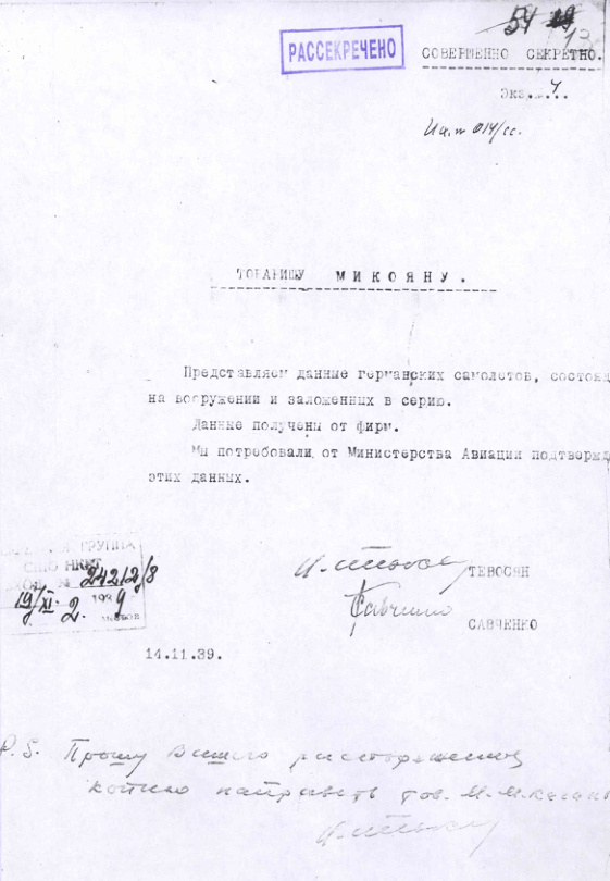 Таблица данных немецких самолетов состоявших на вооружении и заложенных в серию в 1939 году. 19 ноября 1939 г.