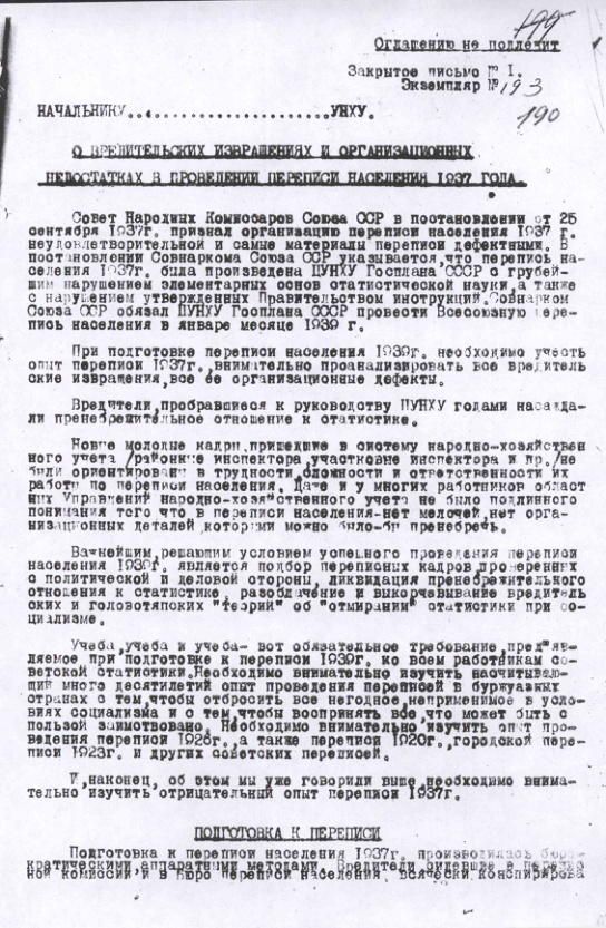 - Закрытое письмо Бюро Всесоюзной переписи населения 1939 года "О вредительских извращениях и организационных недостатках в проведении переписи населения 1937 г." 10 декабря 1937 г.