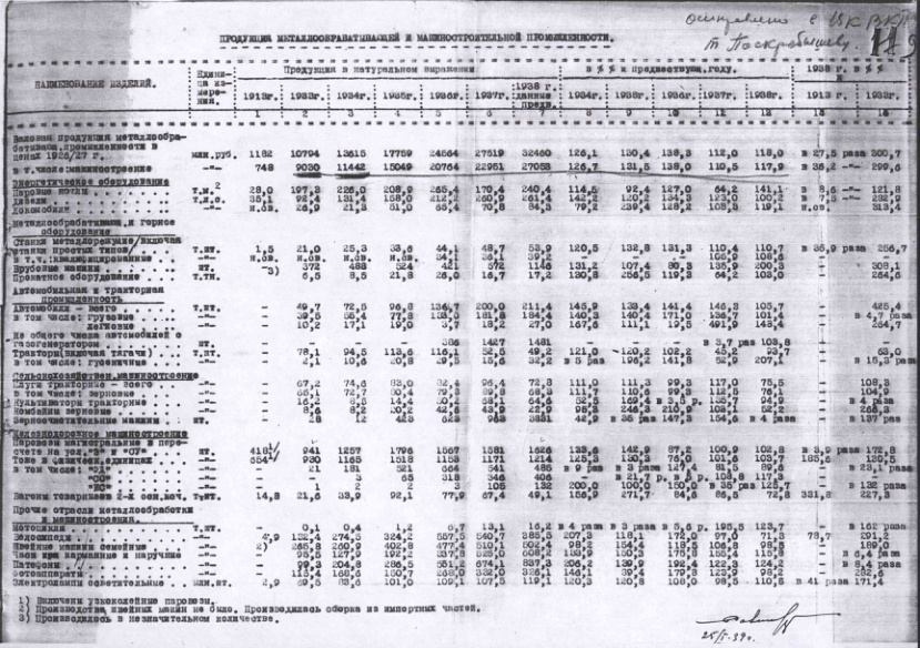 - Справка о производстве продукции металлообрабатывающей и машиностроительной промышленности в 1913 г. и 1933-1938 гг. 25 января 1939 г.