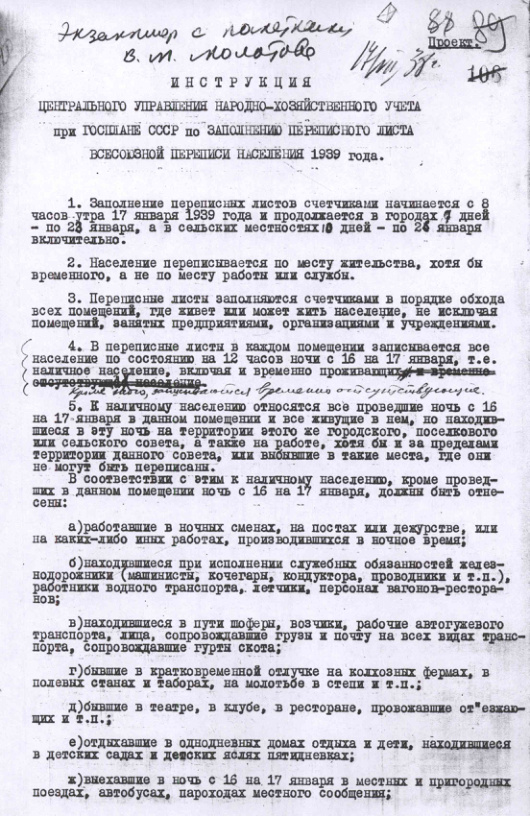 Проект инструкции ЦУНХУ по заполнению переписного листа Всесоюзной переписи населения 1939 г. 17 июля 1938 г.