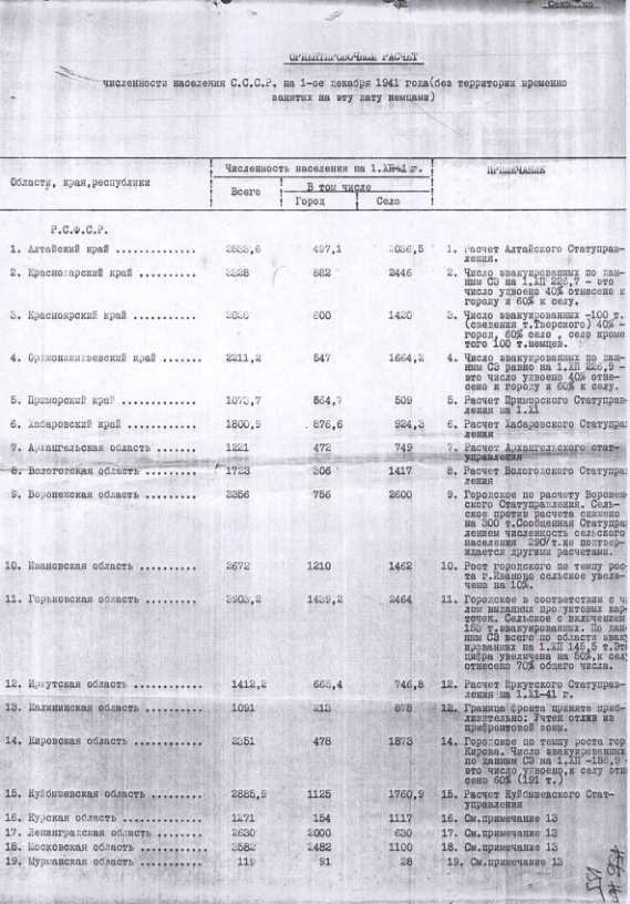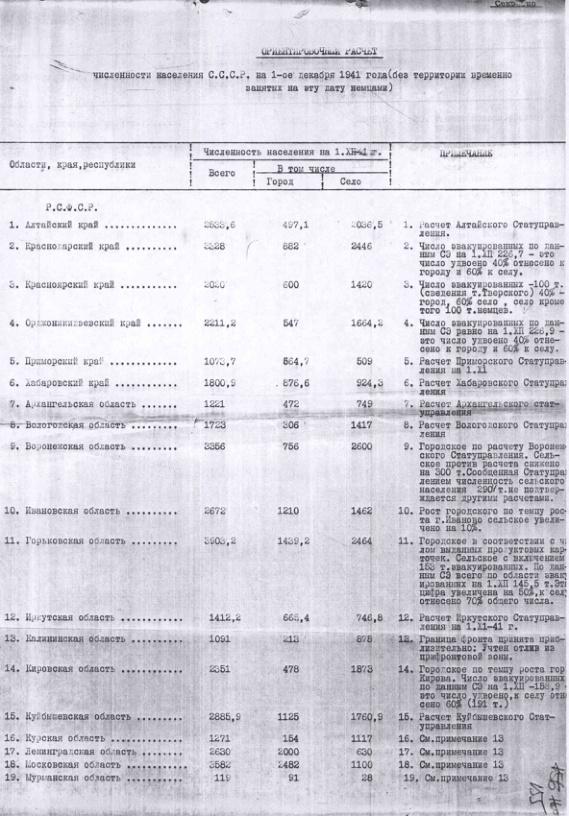 - Ориентировочный расчет численности населения СССР на 1 декабря 1941 г. (без территории временно занятых на эту дату немцами).