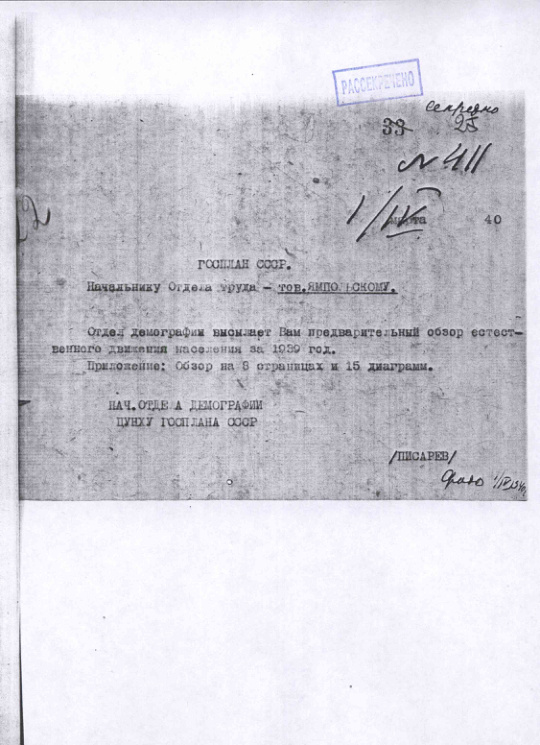 Предварительный обзор естественного движения населения СССР за 1939 г. 1 апреля 1940 г.