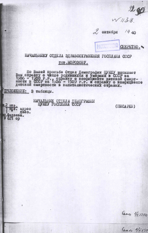 Справка ЦУНХУ о числе родившихся и умерших в 1936-1939 гг. 2 октября 1940 г.