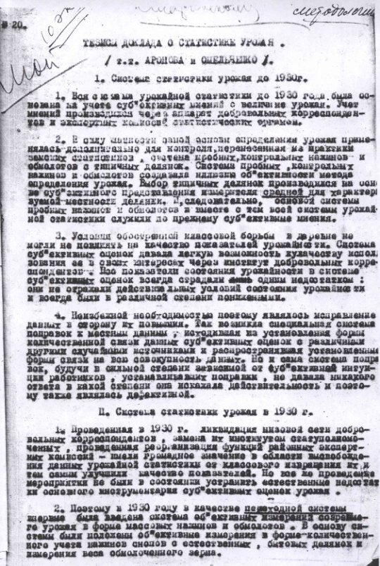 Тезисы доклада о статистике урожая Аронова и Омельченко. 1932 г.