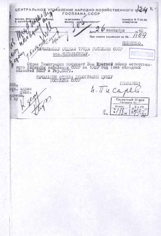 Краткий обзор естественного движения населения СССР за 1939 г. Без западных областей УССР и БССР. 26 сентября 1940 г.