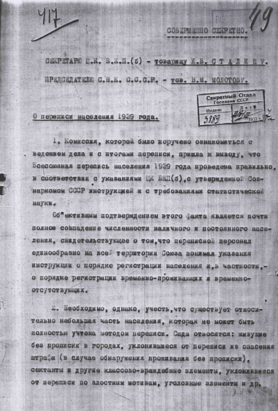 Докладная записка на имя И.В. Сталина и В.М. Молотова о результатах переписи населения по состоянию на 21 марта 1939 г.