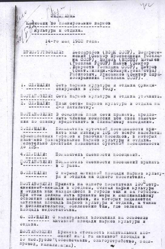 Протокол заседания комиссии по планированию парков культуры и отдыха 14 мая 1933 года.
