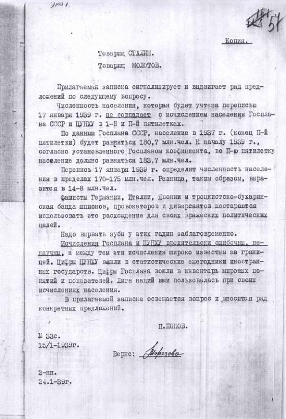 Докладная записка бывш. начальника ЦСУ П.И.Попова на имя И.В.Сталина и В.М. Молотова, о предстоящем результате переписи населения 1939 года и критикой ЦУНХУ и Госплана. 15 января 1939 г.
