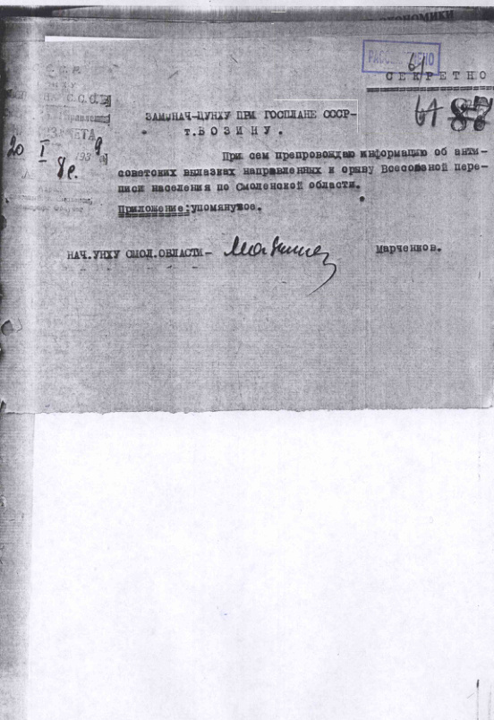 Письмо об антисоветских вылазках направленных к срыву переписи населения 1939 г. в Смоленской области. 20 января 1939 г.