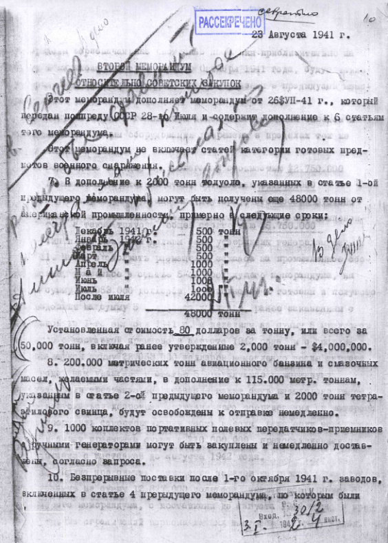 Второй меморандум относительно советских закупок в США. 23 августа 1941 г.