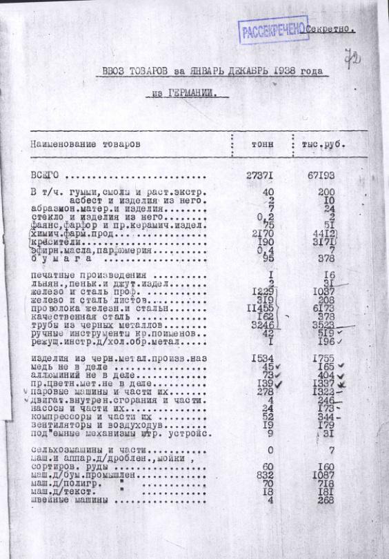 Справка о ввозе товаров в СССР из Германии за январь-декабрь 1938 года. 8 мая 1941 г.