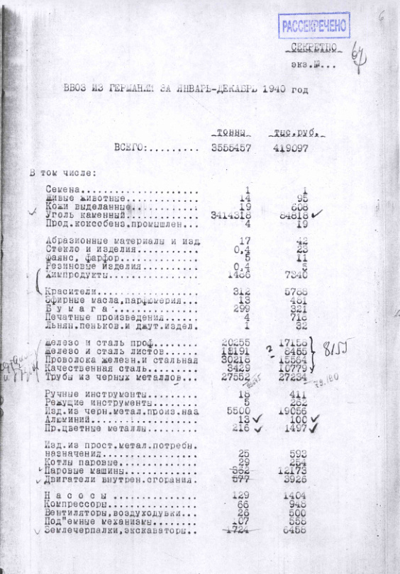 Справка о ввозе товаров в СССР из Германии за январь-декабрь 1940 года. 8 мая 1941 г.
