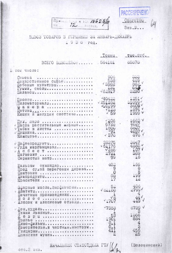 Справка о вывозе товаров из СССР в Германию за январь-декабрь 1938 года. 8 мая 1941 г.