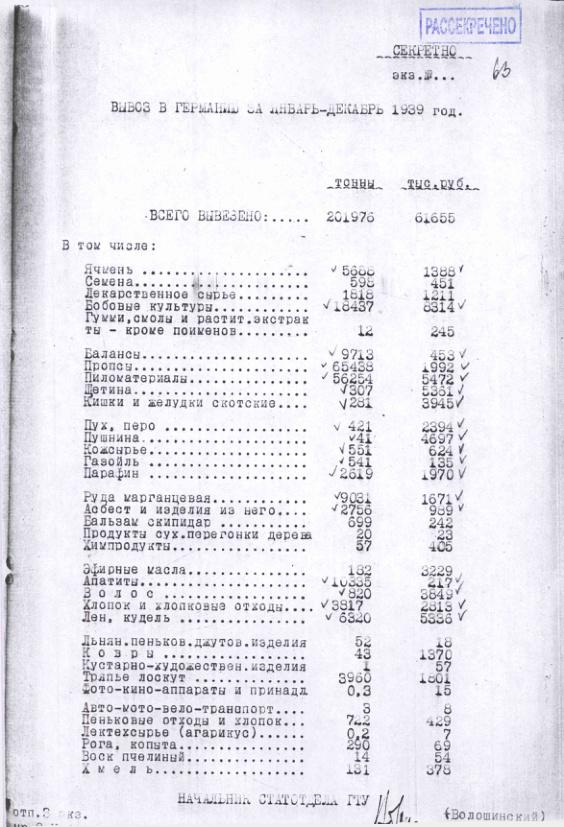 Справка о вывозе товаров из СССР в Германию за январь-декабрь 1939 года. 8 мая 1941 г.